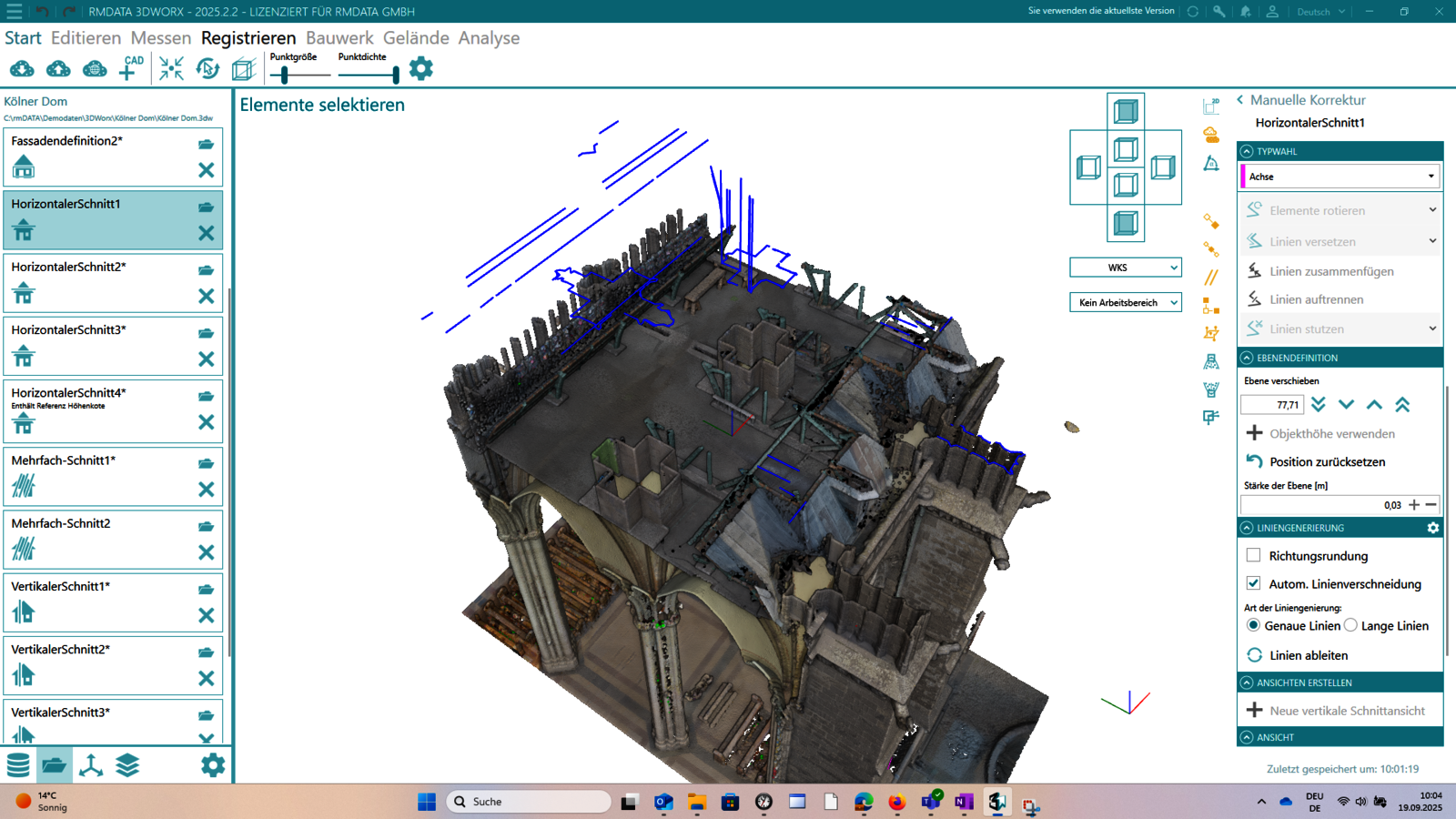 Michael Jürkel beschreibt den Nutzen der Software: „Durch das freie Bewegen der Schnittebene in der Höhe im Workflow ‚horizontaler Schnitt‘ kann ich immer exakt jenen Bereich des Doms vektorisieren, für den ich eine Planung erstellen möchte.“