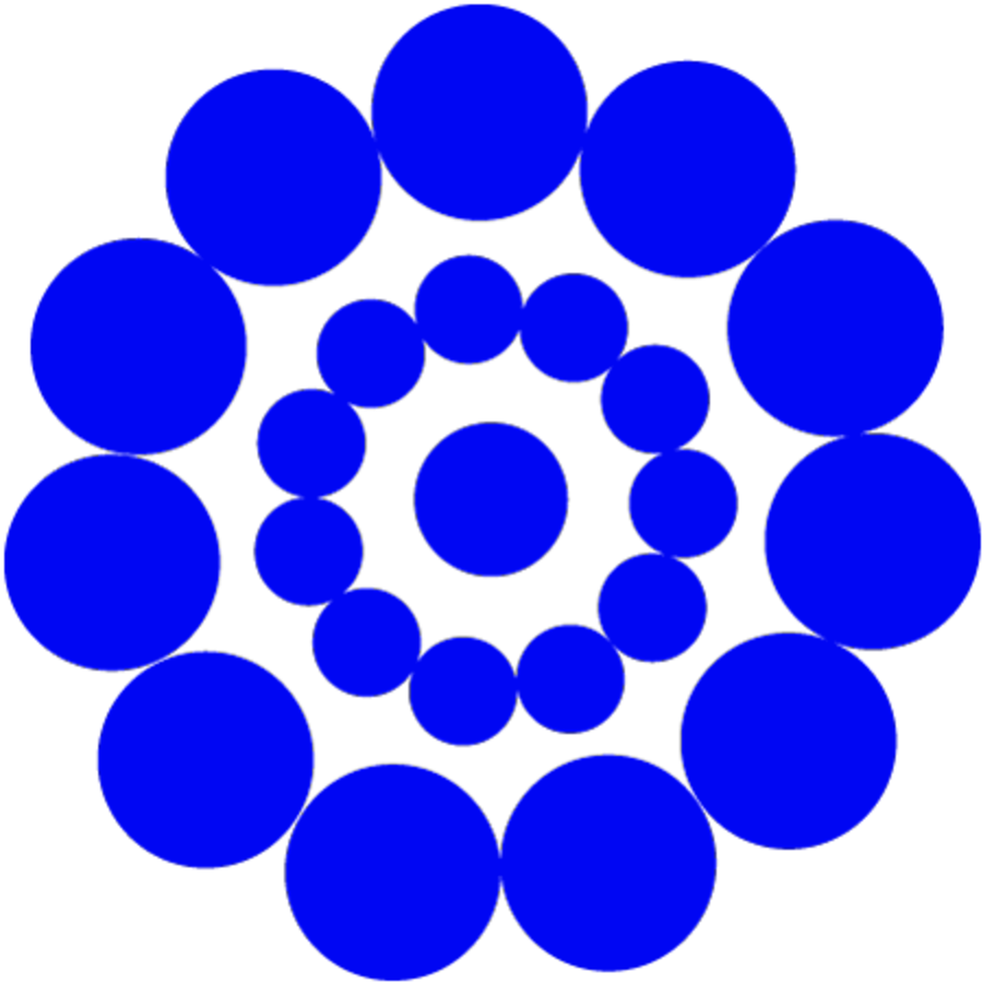 Abstraktes Muster aus blauen Kreisen, die konzentrisch in mehreren Ringen um einen zentralen Kreis angeordnet sind. Die Anordnung erinnert an eine Blüte oder Spirale aus Kugeln.