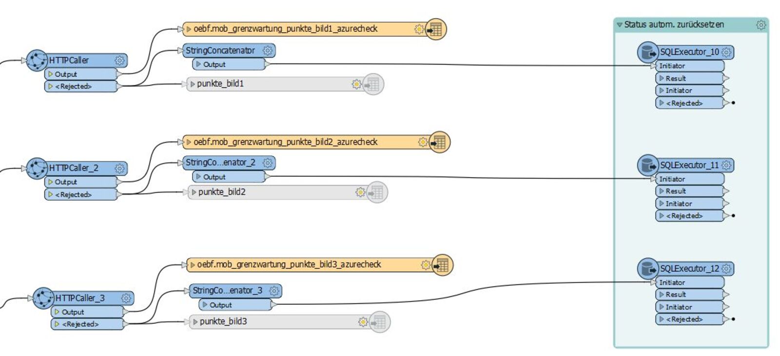 Neben diesen Kernprozessen läuft am FME Server in einem längeren Intervall auch ein Prüfjob, der mit einem „HTTPCaller“-Transformer checkt, ob das betreffende Foto auch tatsächlich aus dem Speicher heruntergeladen werden kann und eventuell korrigiert werden muss.