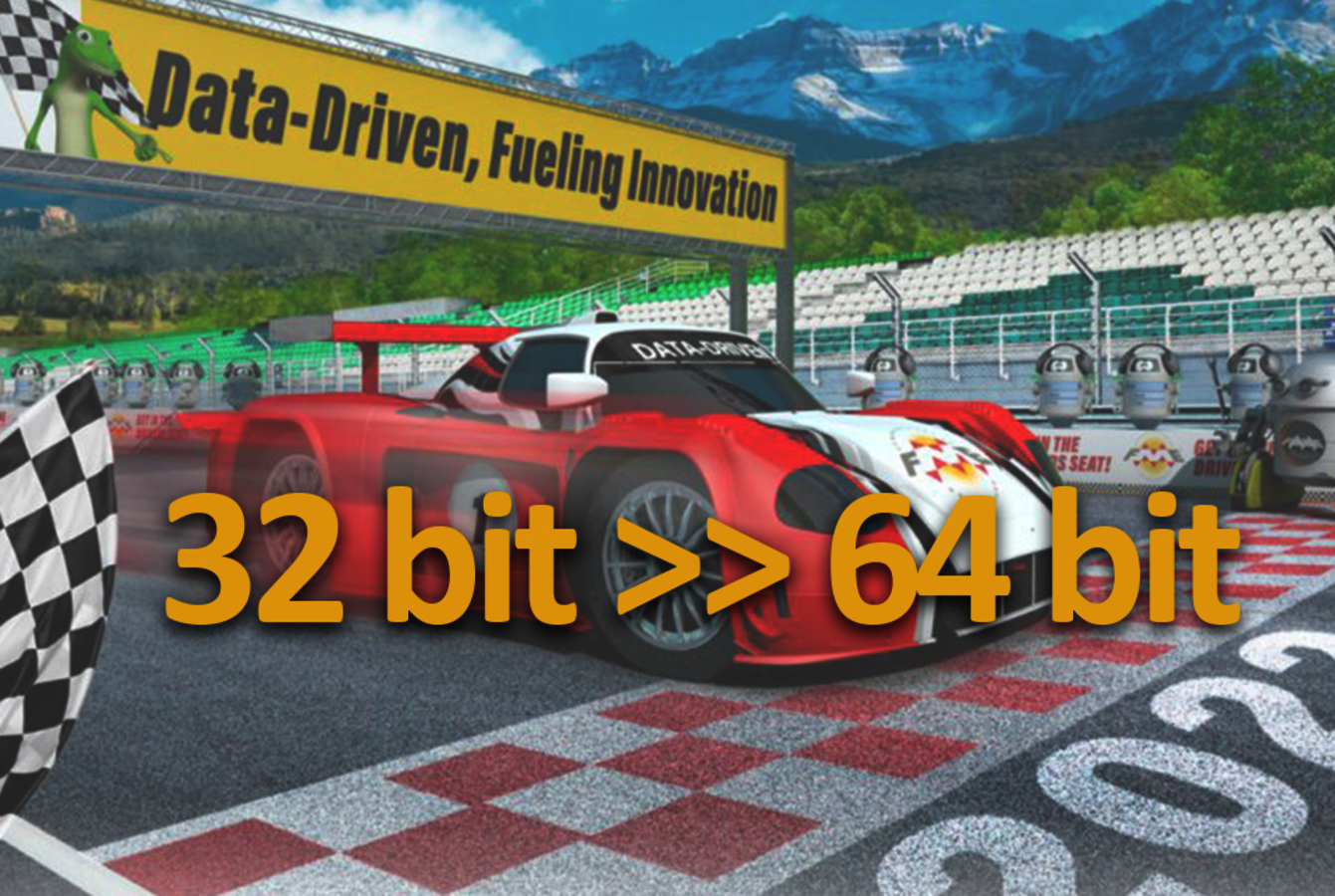 Roter Rennwagen steht an der Startlinie einer Rennstrecke; im Hintergrund ein Banner mit Data-Driven, Fueling Innovation und der überlagerte Text 32 bit >> 64 bit kündigt den Wechsel an.