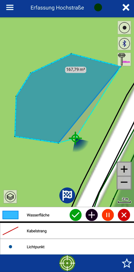 Beim Erfassen einer Linie wird die aufgenommene Länge und bei einem Polygon die aufgenommene Fläche angezeigt. Diese Werte werden auch direkt in das aufgenommene Objekt gespeichert. Auch in der Sachdatenmaske werden Punktkoordinate, Länge bzw. Fläche direkt nach der Erfassung richtig visualisiert.