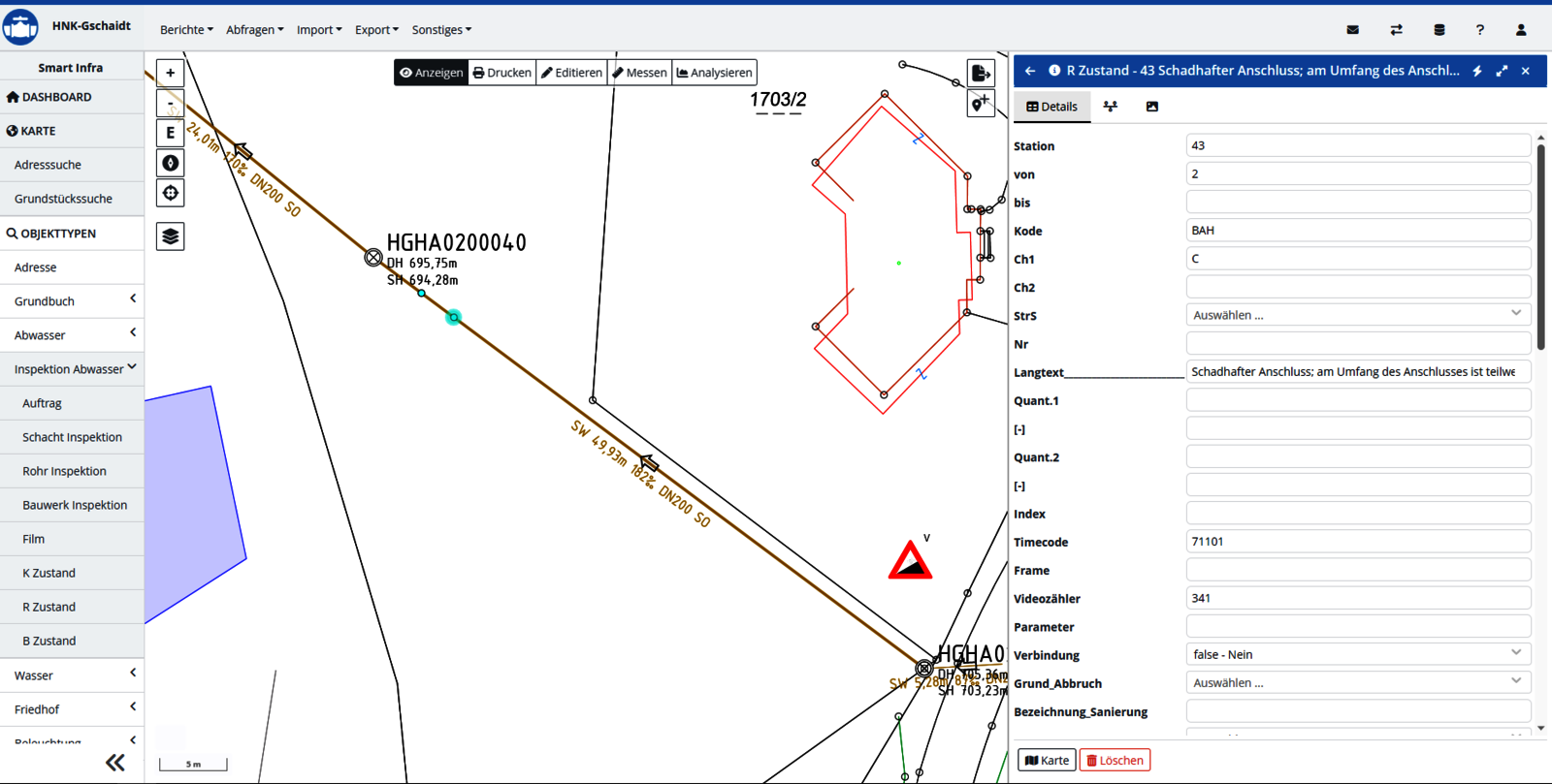 Kanalinspektionen im Bereich der Abwasserentsorgung liefern wichtige Informationen zum Zustand einzelner Rohrleitungen. Mit der neuen Version sehen Sie sämtliche Auffälligkeiten inklusive Fotos bzw. Videos entlang der Haltungen mit allen Detailinformationen direkt in der Karte. Notwendige Sanierungsmaßnahmen aufgrund von Rissbildungen, Einbrüchen oder anderer Schäden leiten Sie damit frühzeitig ein.