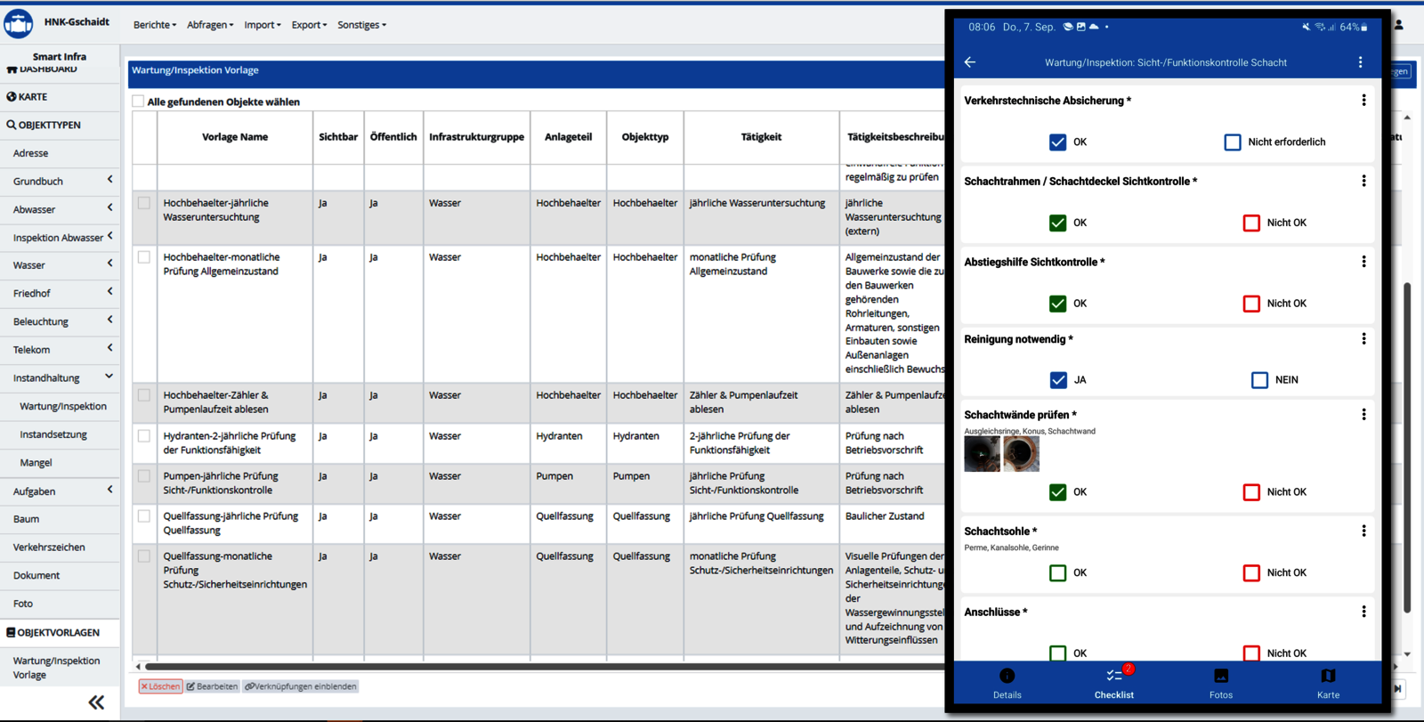 Um die Lebensdauer von Infrastrukturanlagen zu maximieren, unterstützt die neue Version von rmDATA Smart Infra sämtliche Tätigkeiten rund um Ihre kommunale Infrastruktur digital. Das Planen, Durchführen und Dokumentieren sämtlicher Instandhaltungsmaßnahmen, Mängel, Wartungs- und Inspektionstätigkeiten erfolgen direkt in rmDATA Smart Infra sowie vor Ort mittels rmDATA Mobile Tasks. Die Ergebnisse der Prüfung von Hochbehältern, von Funktionskontrollen bei Pumpwerken oder des Tausches von Beleuchtungskörpern dokumentieren Sie nahtlos und objektbezogen. Dabei entscheiden Sie, ob Tätigkeiten von Ihnen selbst oder von externen Partnern durchgeführt werden sollen. So können Sie die gesamte Instandhaltungshistorie, genauso, wie geplante Wartungen und Inspektionen sämtlicher Infrastrukturobjekte jederzeit abrufen.