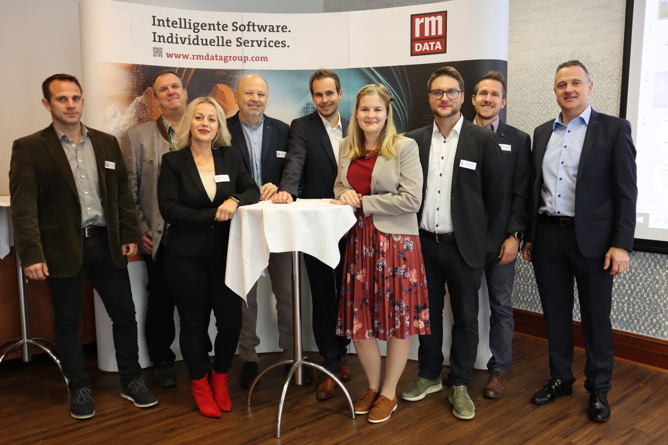 Eine Gruppe beruflich gekleideter Menschen posiert an einem Stehtisch bei einer Firmenveranstaltung. Im Hintergrund ist ein Banner mit dem Text 'Intelligente Software. Individuelle Services.' und dem rmData-Logo zu sehen; es wirkt wie ein Networking- oder Präsentationsmoment.