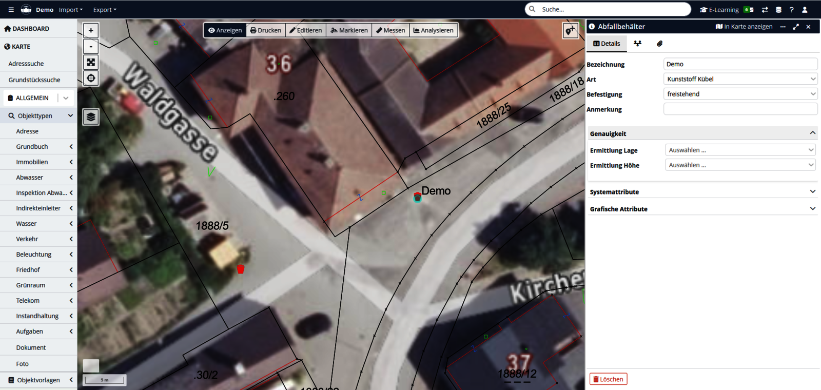 Neu ist der Objekttyp Abfallbehälter: Diese lassen sich in der Karte erfassen, verwalten und mit Wartungen, Aufgaben, Fotos und Dokumenten verknüpfen. Damit wird die strukturierte Abfallbewirtschaftung erheblich erleichtert.