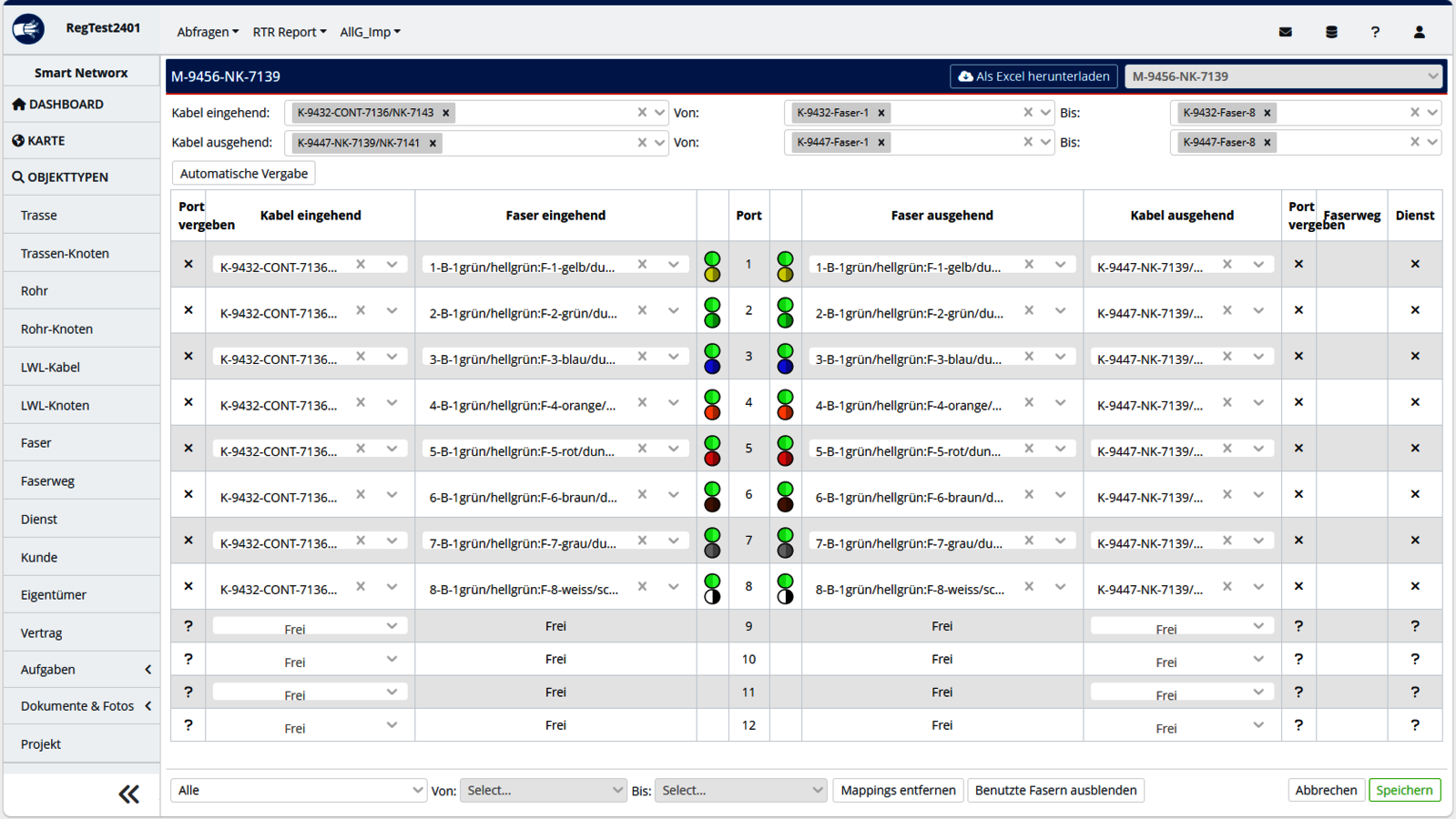 Vor allem bei LWL-Kabeln mit sehr vielen Fasern, die nicht alle über denselben LWL-Knoten via Patchungen oder Spleißungen verbunden sind, ist das Verbinden jeder einzelnen Faser sehr aufwändig. Mit den Erweiterungen im Verbindungsdialog legen Sie nun im Zuge der „Automatischen Vergabe“ auch Faserbereiche beim eingehenden sowie beim ausgehenden LWL-Kabel fest.