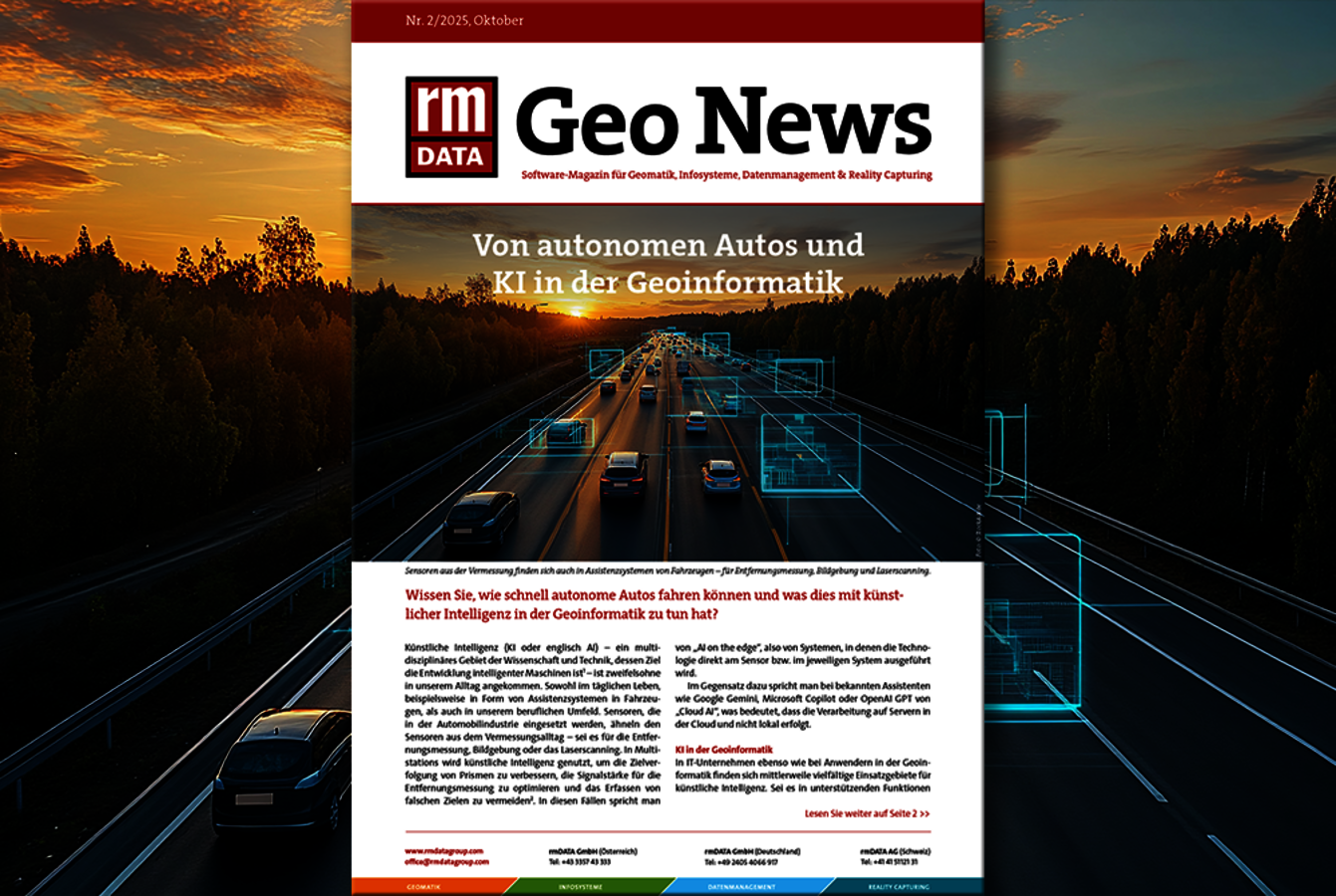 Welche Anwendungen gibt es von künstlicher Intelligenz in der Geoinformatik und welchen Nutzen bringt künstliche Intelligenz im Alltag eines Vermessers und wie unterscheiden sich Theorie und Praxis? Diesen Fragen geht Thomas Marschall, Produktmanager bei rmDATA, im Leitartikel der aktuellen Ausgabe des Firmenmagazins nach. In den Anwendungsartikel berichten erfolgreiche Kunden über ihre Anwendungen beim Scannen einer Tiefgarage, über den Vorteil zentraler Verwaltung von Projektdaten, über intelligent gesteuerte Baumaschinen, punktgenaue Vermessungsdaten für Bauprojekte oder Datenerfassung in Echtzeit.