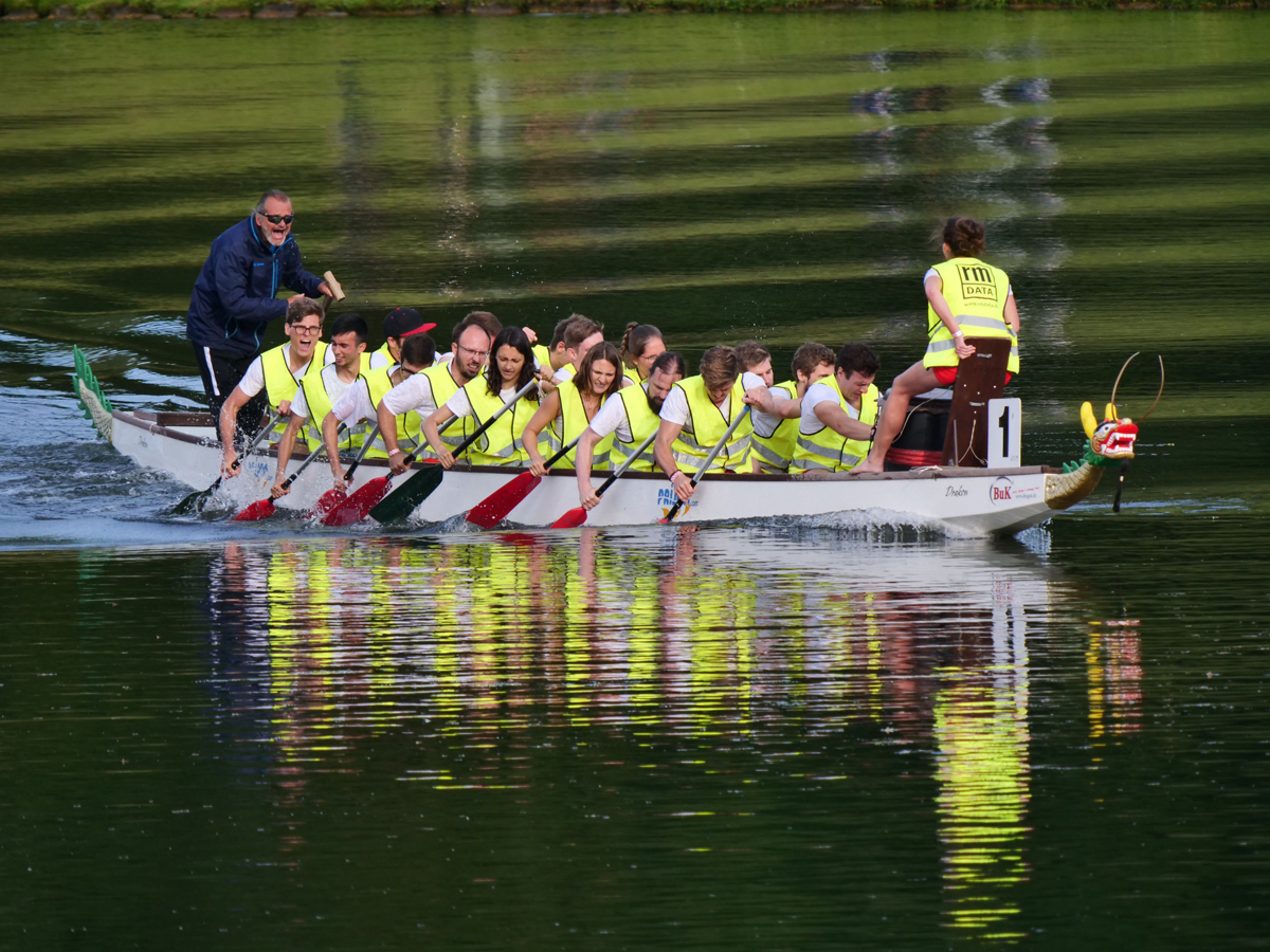 „Es war eine riesen Gaudi und unser Team „Rote Hose“ ist zur Topform aufgelaufen. Nach der Absteckung der Strecke bei strömenden Regen am Vortag, stand das Rennen unter keinem guten Stern. Entgegen aller Prognosen klarte es am Renntag auf und die Motivation bei allen Teams war wieder bei 100%. Nach zwei harten Qualifikationsrennen und dem Halbfinale haben wir es bis ins Finale geschafft und konnten uns als völlige Außenseiter den unglaublichen 2. Platz sichern!“, berichtet Lukas Raffl begeistert vom 10. Drachenbootrennen am Münchner Olympiasee. Wir von rmDATA unterstützten die Teilnehmer des Lehrstuhls für Geodäsie an der TU München mit einheitlichen Warnwesten.