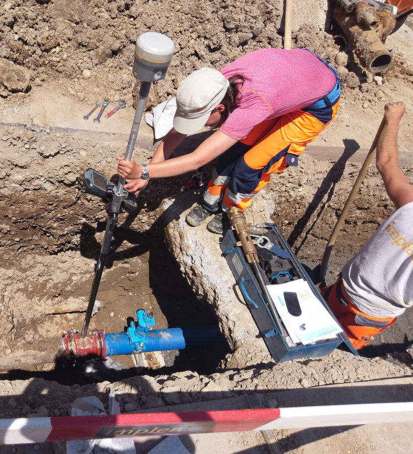 Eine Person in pinkem T‑Shirt und orangefarbener Schutzkleidung kniet in einem Graben und setzt ein Messgerät an eine blaue Rohrleitung an; daneben liegt eine tragbare Messkiste, während eine weitere Person am Rand steht.