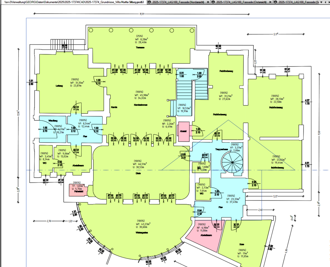 After registration and correction, the office staff derived geometries from the point clouds. The surveying engineer emphasizes that they are becoming faster and more efficient from project to project: "The learning curve in 3DWorx is very steep and it was exciting to explore all the possibilities in the software for the listed villa." Grünhagen exported the DWG files to rmDATA GeoMapper for final elaboration, dimensioning and surface calculation in accordance with DIN277.
