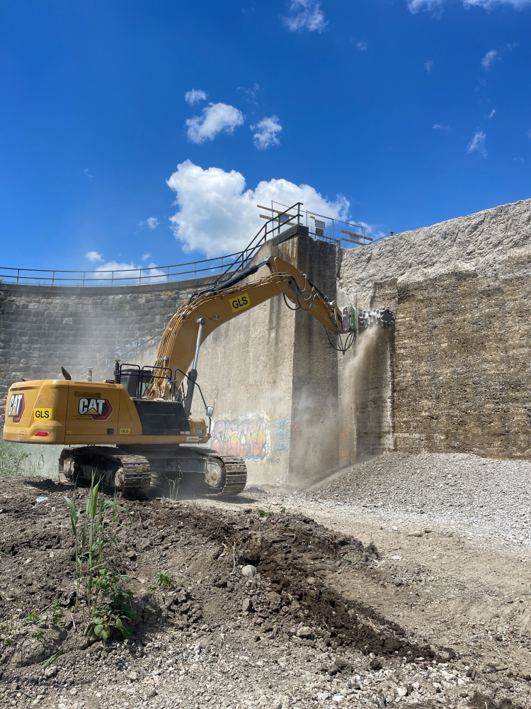 In a current project in Vienna-Auhof, the dividing walls and weir walls of six retention basins are being renovated. The damaged concrete is being removed (milled off) and replaced with reinforced facing concrete.