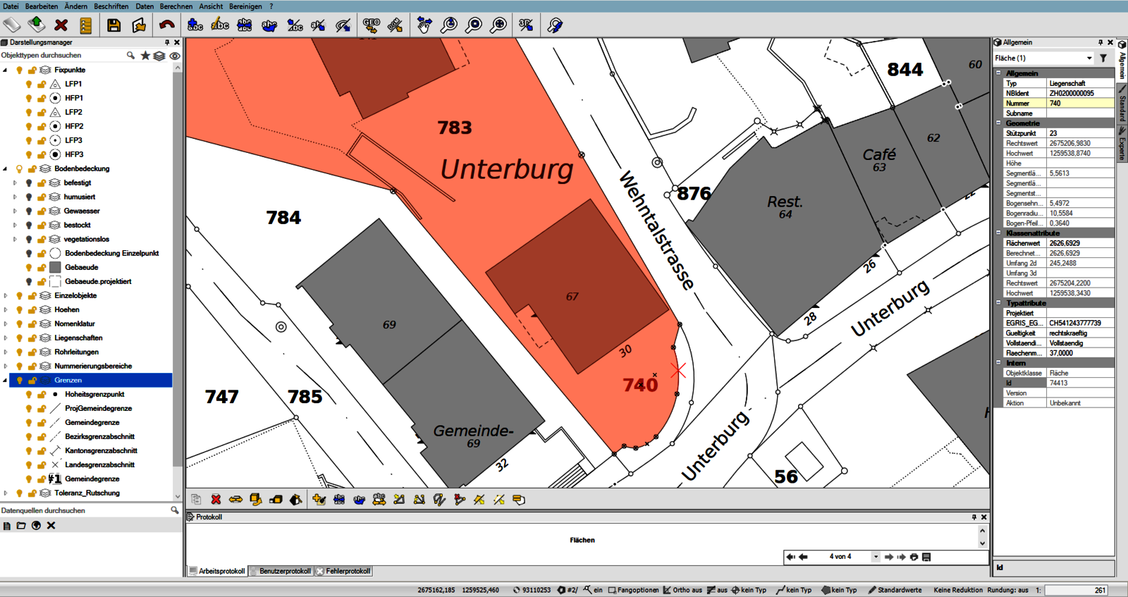 En outre, rmDATA GeoMapper vous offre également la possibilité de créer très simplement et rapidement des projets de mutation sur la base de la mensuration officielle. Divers automatismes, allant de la division des surfaces jusqu'à le production d'états descriptifs des biens-fonds, complètent cette fonctionnalité. Pour cela, aucune licence SIG "coûteuse" n'est bloquée..