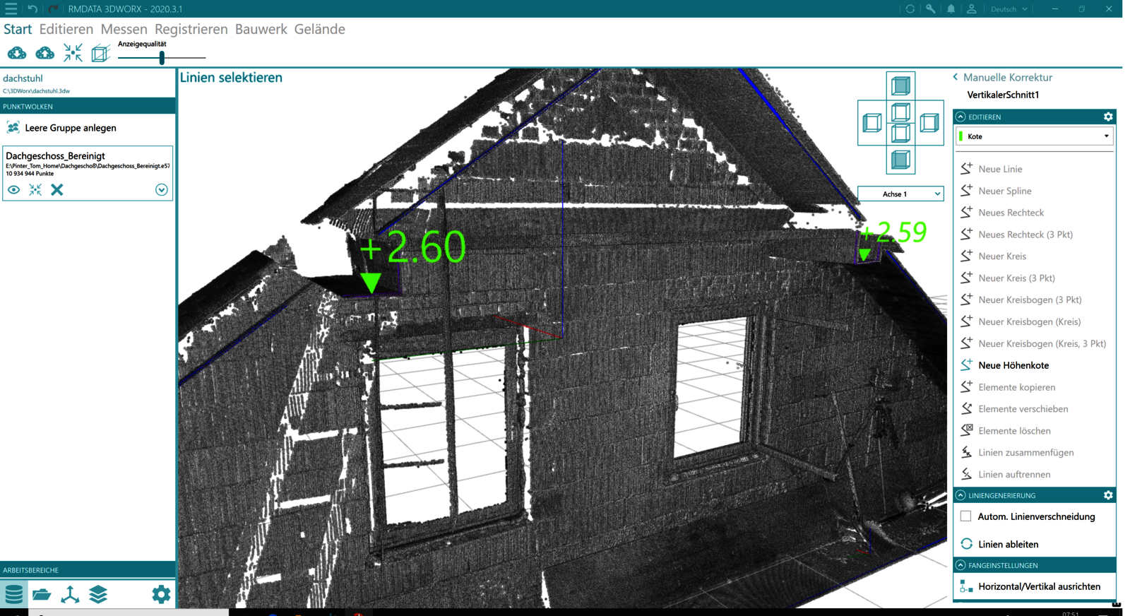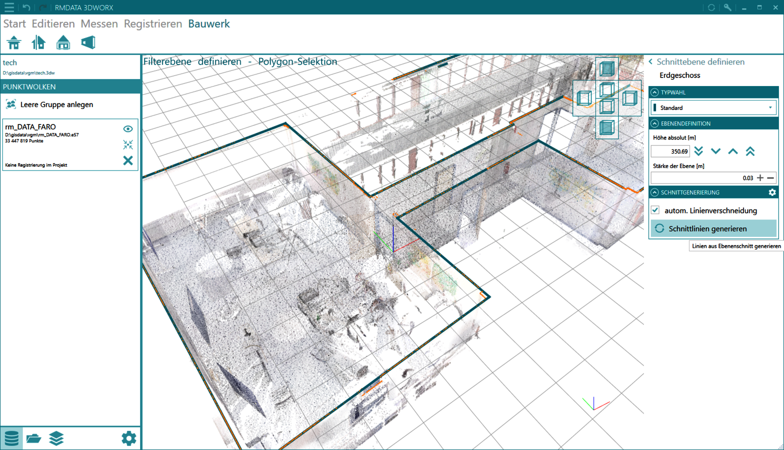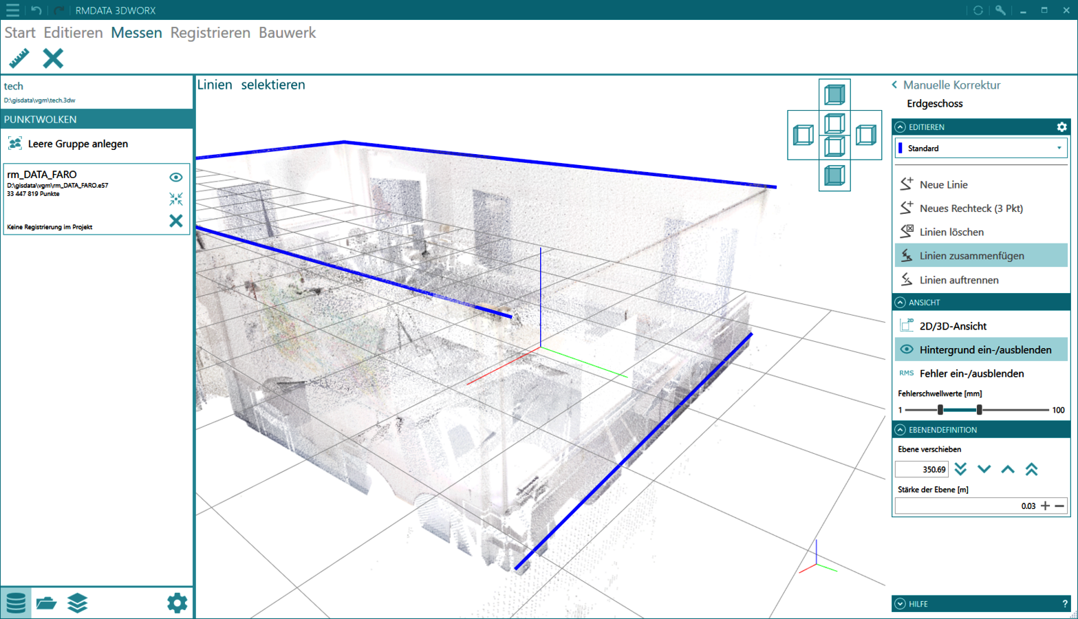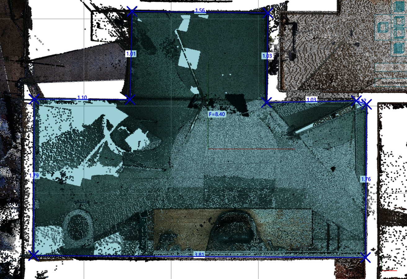 - Utilisez l'intersection 3D des plans trouvés automatiquement pour extraire les bords exacts du nuage de points. Les lignes obtenues de cette manière ne doivent plus être saisies manuellement.