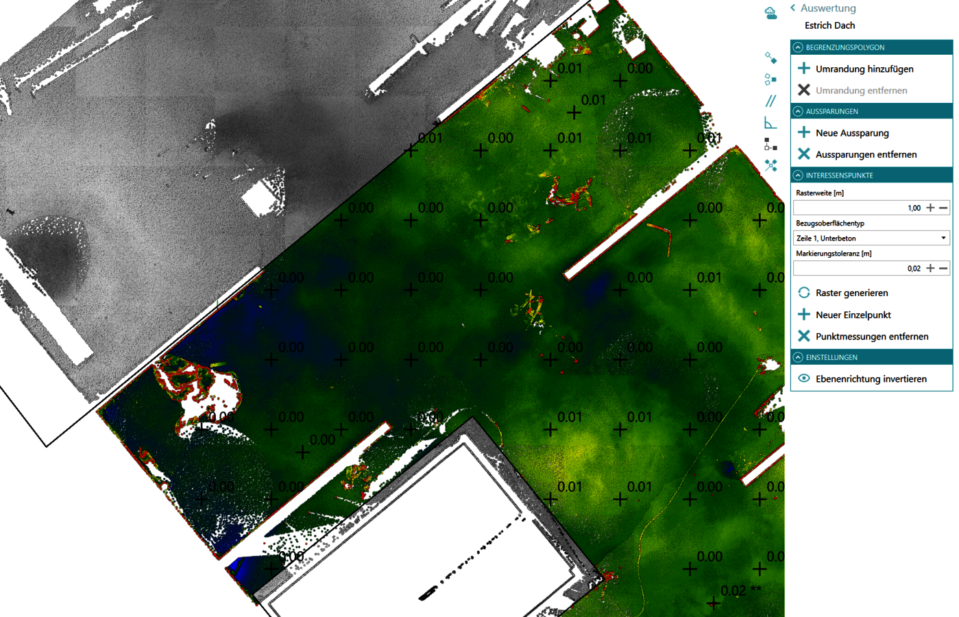- Le module Analyse de nuages de points démarre avec un flux de travail qui simplifie considérablement le contrôle de la planéité (analyse de planéité) sur la base de nuages de points denses. Avec ce module, l'utilisateur effectue un contrôle de planéité en quelques clics. rmDATA 3DWorx offre de nombreuses possibilités de représentation graphique.
