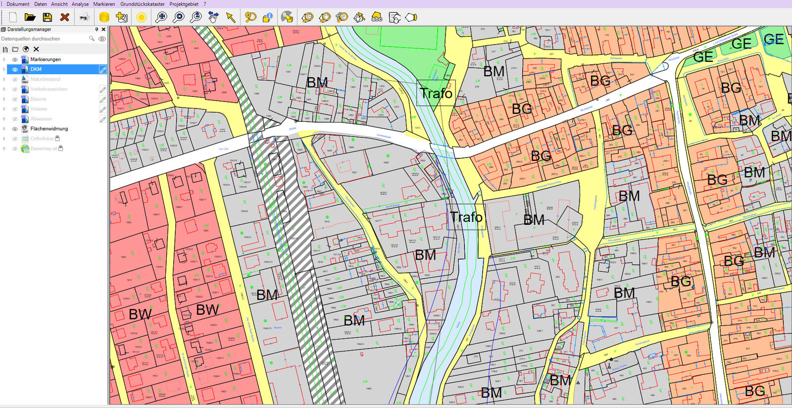 Dans rmDATA GeoDesktop, vous fusionnez les données SIG et DAO, de façon autonome et directe: Voici un extrait des types de données disponibles: DKM avec propriétaire, données de conduites, orthophotos, plans d’occupation des sols, données d’adresses, Web Map Services (WMS), AutoCAD DWG/DXF, fichiers Esri Shape, données en accès libre (comme les fichiersOpenStreet Map)