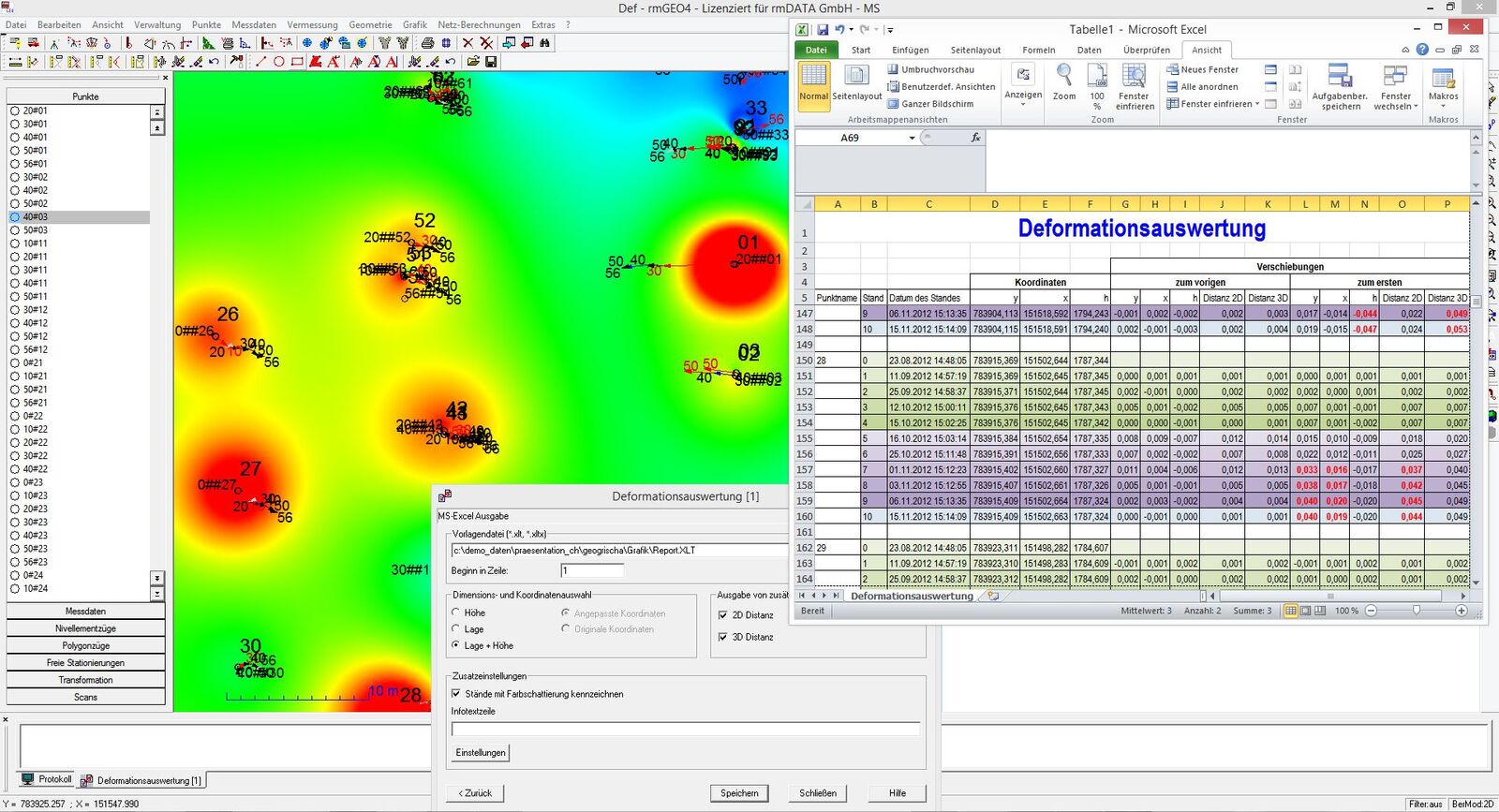 Zahlreiche Module ergänzen den Funktionsumfang, wie z.B. das Deformationsauswertung (rechts im Bild).