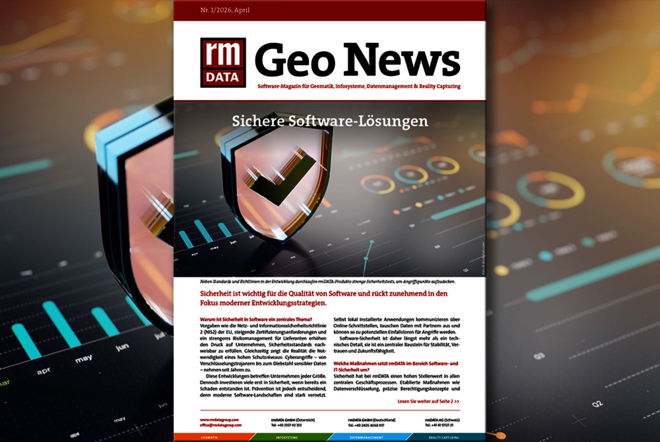 Titelseite der IT-Fachzeitschrift Geo News. Überschrift: Sichere Software-Lösungen. Zentral eine glänzende Schutzschild-Illustration mit Haken vor einem Hintergrund aus digitalen Grafiken.